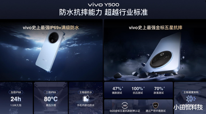 想要耐用手机,就一定要看手机的防水和抗摔实力到底如何。就拿vivo Y500来说,称它是千元耐用王者一点也不夸张,因为它的机身采用的是金刚磐石架构,而且中框还专门进行了加厚处理,在抗摔方面手机成功通过各种严苛抗摔测试,获得了SGS金标五星整机抗跌耐摔认证!不仅如此,它还支持IP69+满级防水,并且有着主板级防水实力,即便是在水里泡上24小时也不会坏掉。这样的耐用新机,也难怪会如此受欢迎了。